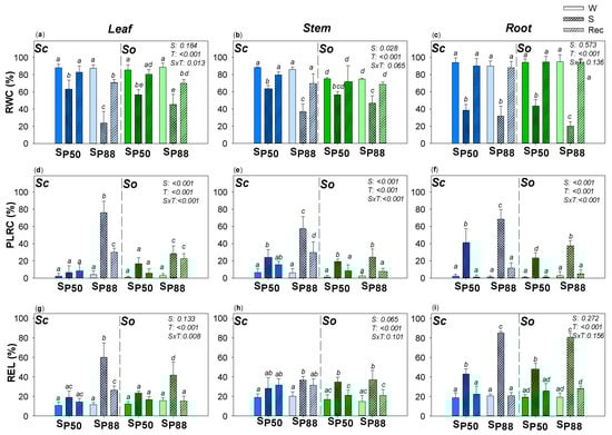 4.3. Estimating the Relative Water Content, Rehydration Capacity and Cell Membrane Integrity of Leaf, Stem and Root Samples Experiencing Drought-Recovery Treatment