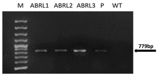 The expression of the rolB gene in wild type and transgenic regenerants of A. bracteosa was assessed by qPCR. We found no expression of the rolB gene in the WT plants. Overall, transgenic line 3 (ABRL3) showed the most significant expression (** p < 0.01) of the rolB gene, followed by transgenic line 2 (ABRL2) and transgenic line 1 (ABRL1), as given in Figure 2.