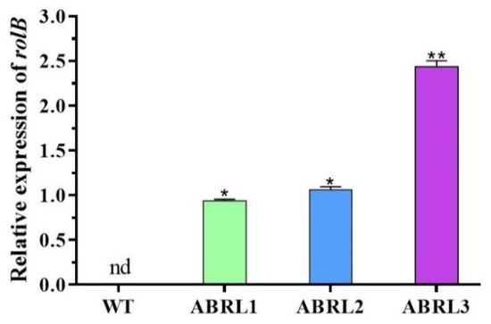 Relative expression of rolB gene in wild type and three independent transgenic lines of A. bracteosa. The expression level was normalized with the β-actin and 18s reference genes. Data are expressed as mean ± S.D. (** p < 0.01, * p < 0.05), nd = not detected.