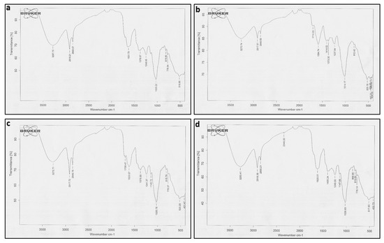FTIR analysis was used to determine the functional groups of active compounds present in both transformed and wild-type plant extracts of A. bracteosa. The wavelength of light absorbed is a salient feature of the chemical bonds, as can be seen in the annotated spectra (Figure 3a–d).