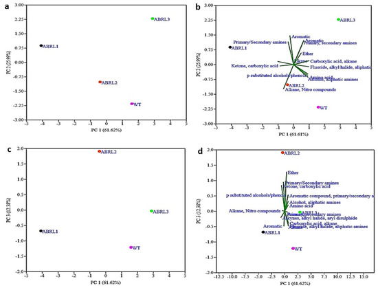 The multivariate statistical analysis technique, PCA, successfully explains the variability in each data set. In the current study, PCA was used to evaluate the extent of similarities or differences between multiple plant samples based on the number of detected functional groups. Here, PCA recognized three significant components: principal component 1 (PC1) explained 61.62% of the variance, while principal component 2 (PC2) had a variation of 25.99%. Principal component 3 (PC3) showed 12.38% of the variability. The combination of PC1 and PC2, as well as PC1 and PC3, categorized the four used plant samples into distinctive regions (Figure 4a,c). This confirmed that significant diversity of functional groups did exist in all samples. A biplot marked a clear relationship among different lines of A. bracteosa and their functional groups (Figure 4b,d).
