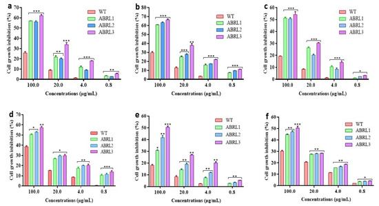 Cytotoxic activity of Ajuga bracteosa against (a) HepG2, (b) LM3, (c) HT-29, (d) A549, (e) MCF-7, and (f) MDA-MB-231. WT = wild type untransformed A. bracteosa plants; ABRL1–3 = transgenic lines 1–3 of A. bracteosa. Each value represents mean ± SD (n = 3). * p < 0.05, ** p < 0.01, and *** p < 0.001 are statistically significant data.