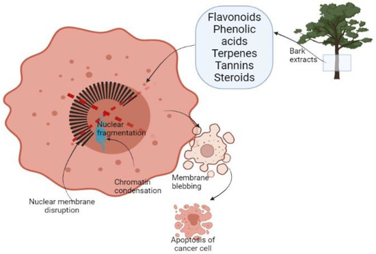Cell death appears by two alternate modes apoptosis or necrosis. These two ways are different because the first one is programmed managed cell death without a local inflammatory response. Necrosis is characterized as a passive unexpected form of cell death dependent on environmental disturbance with the unrestrained release of inflammatory response. Apoptotic cells go through diverse morphological transformations such as membrane blebbing, chromatin condensation, nuclear membrane disruption, nuclear fragmentation, and dissolution (Figure 1). The first sign of apoptosis is the apoptotic body [81]. Cell apoptosis develops through the mitochondria-mediated intrinsic pathway or death receptor-induced extrinsic pathway. It was observed that BE from Pinus massoniana has a role in both pathways. After the treatment of HeLa cells the expression of Bax, a proapoptotic protein vigorously increased. Cell apoptosis was induced by releasing of cytochrome C [82,83].