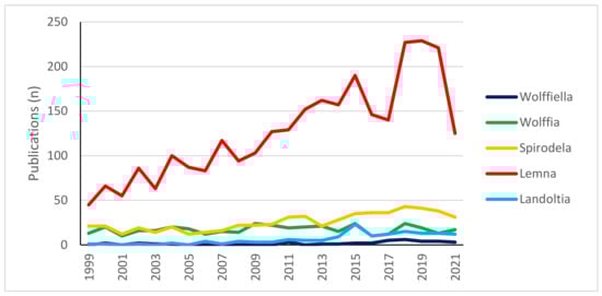 The family Lemnaceae comprises five genera (Wolffia, Wolffiella, Spirodela, Lemna, Landoltia) and currently includes 36 accepted species [14,15]. Scientific interest in these plants has been increasing in the last two decades, but the number of publications is not distributed uniformly among these genera. The trend of growth in interest focused on the genus Lemna (Figure 1).