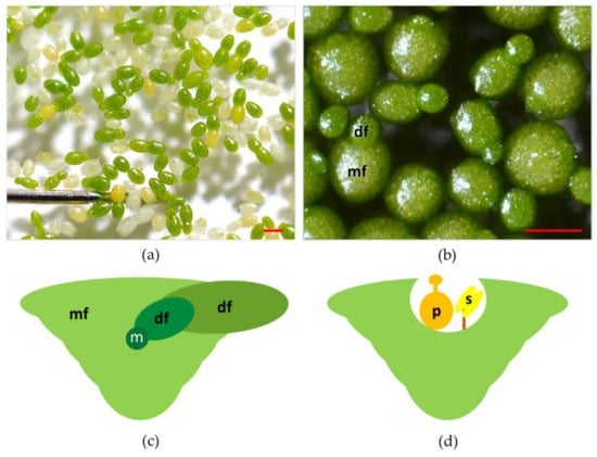 (a) Top view of plants of Wolffia arrhiza also showing a stainless-steel pin for size comparison; (b) close view of plants of Wolffia arrhiza. Some individual plants feature both the mother frond (mf) and the daughter frond (df); (c) schematic transversal section of a plant of Wolffia sp. vegetatively reproducing, mother frond (mf), meristem (m), daughter frond (df); (d) schematic transversal section of a plant of Wolffia sp. in full bloom, pistil(p), stamen (s). Red bars = 1 mm.