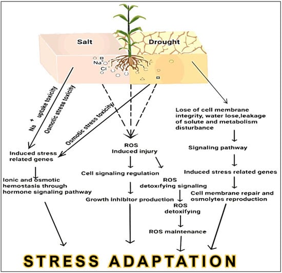 Global crop productivity is restricted due to abiotic stresses such as drought, salinity, flooding, nutrient deficiency, and environmental toxicity. Among these abiotic stresses, salinity and drought are the most severe constraints for sustainable agriculture on a global scale. Nearly 7% of terrestrial land is affected by salinity [1], while drought is widespread and increasingly common in recent years due to climate change. Altogether, salinity- and drought-affected lands cover approximately 10.5 and 60 million km2, respectively [2]. Furthermore, climatic changes worsen the frequency and intensity of water shortages in subtropical areas of Asia and Africa. As stated by the UN climatic report [http://www.solcomhouse.com/drought.htm; accessed date on 12 July 2021], rising temperatures are melting the Himalayan glaciers that feed Asia’s largest rivers (Indus, Ganges, Brahmaputra, Yangtze, Mekong, Salween, and Yellow), and those glaciers may disappear by 2035. Additionally, long-term trends indicate that the progressive proliferation of salinity has caused the dilapidation of arable land [3]. For instance, in California, over the last century, 4.5 out of 8.6 million hectares of wetted agricultural land have become salt-affected [4]. Currently, it has become a pertinent problem for crop production [5], mostly in arid and semiarid areas.