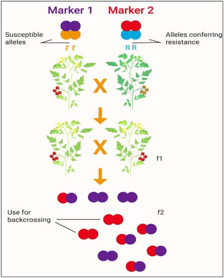 Development of a new crop variety by marker-assisted selection. Source: modified from: [http://b4fa.org/bioscience-in-brief/plantbreeding/how-do-you-develop-a-new-crop-variety-by-marker-assisted-selection-mas/; accessed date on 12 July 2021]. Note: Marker 1 and Marker 2 confer susceptible and resistance alleles, respectively; f1 and f2 indicate the first and second filial generations of offspring, respectively.