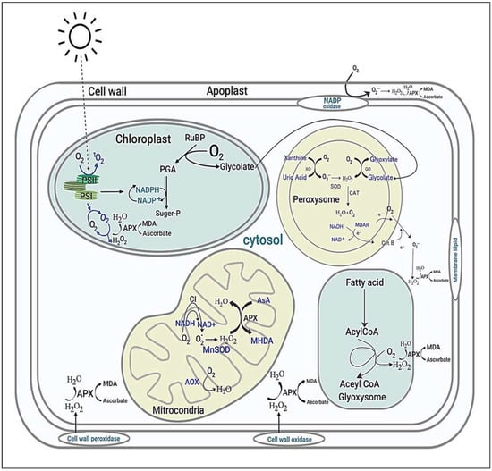 Reactive oxygen species (ROS) are assumed to play roles in many noteworthy signaling reactions in plant metabolism. Under drought and salinity environments, interrupting photosynthesis and increasing photorespiration intermittently alter the regular homeostasis of cells and influence the production of ROS in mitochondria, chloroplasts, and peroxisomes (Figure 6) [142,143].