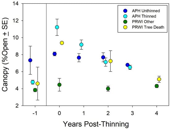 At Fort A.P. Hill (hereafter referred to as APH) and Prince William Forest Park (hereafter referred to as PRWI), both thinning and tree death increased canopy openness. The effect of the thinning experiment at APH and the death of the canopy tree at PRWI on canopy openness is shown in Figure 2. The canopy openness was higher at APH than at PRWI prior to the thinning experiment at APH and the death of the canopy tree at PRWI. At both sites, the canopy openness increased by about 35% following thinning. The canopy openness was highest at the time of the experimental thinning at APH and at the time the canopy tree died at PRWI (Year 0 on the x-axis in Figure 2). At both sites, the canopy openness began to decline over time. This resulted in a significant Thinning effect (z-value = 2.13, p = 0.03), but not a significant Relative Year effect (z-value = 1.92, p = 0.052) or Thinning χ Relative Year interaction (z-value = −0.54, p = 0.59).