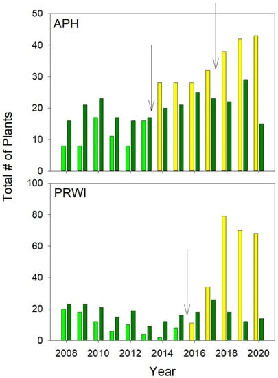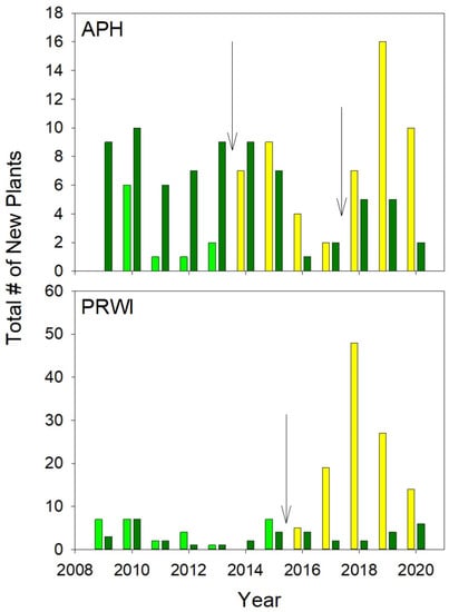 Number of new plants at APH and PRWI. Color codes and arrows are as shown in Figure 3 legend.