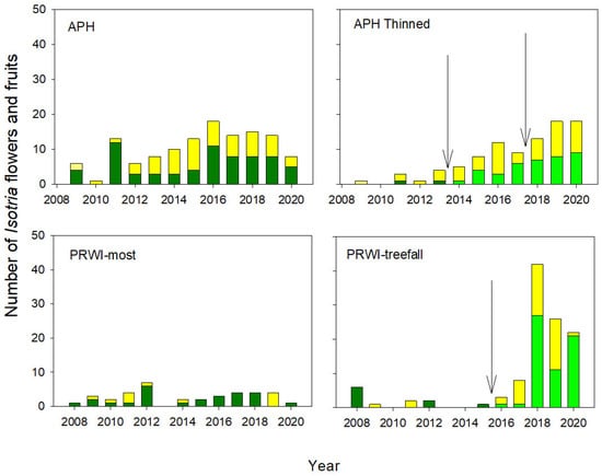 Flowering (green) and fruiting (yellow) in non-thinned (graphs on the left) and thinned (APH) areas, or where a canopy tree died at PWRI (graphs on the right). Color codes and arrows are as described in the legend of Figure 3.