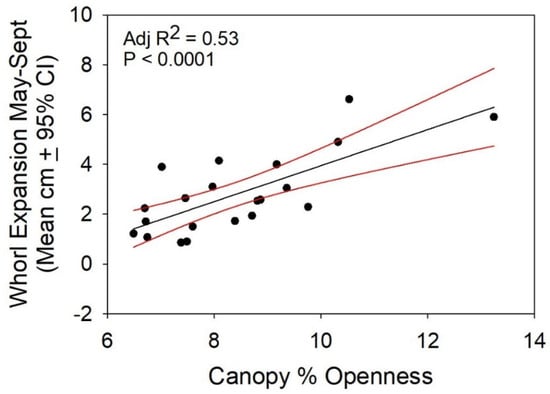 Within-year colony mean whorl expansion as a function of canopy openness. Each point is the mean for a population in a year. The red lines indicate 95% confidence intervals about the regression of whorl expansion on canopy openness. Plants that were growing at sites with more light grew more between May and September.