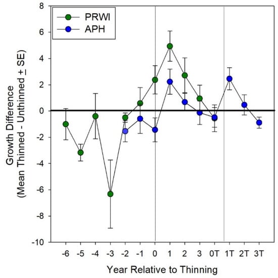 Comparison of plant growth in colonies at Prince William Forest Park (PRWI, green) and Fort A.P. Hill (APH, blue), showing the difference in growth (mean difference between growth ± 1SE) between thinned (or tree death) and un-thinned populations, relative to the year of thinning (treefall for PRWI). The years relative to thinning 0T-3T refer to years 1–3 after a second thinning in these colonies.