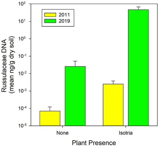 Concentration of Russulaceae DNA in soil samples collected in the “natural experiment” population, where a tree died and fell, in areas where no plants occurred (left bars) and areas where plants emerged (right bars) in 2011 (yellow bars, data from []) and 2019 (green bars). Note the log scale on the y-axis.