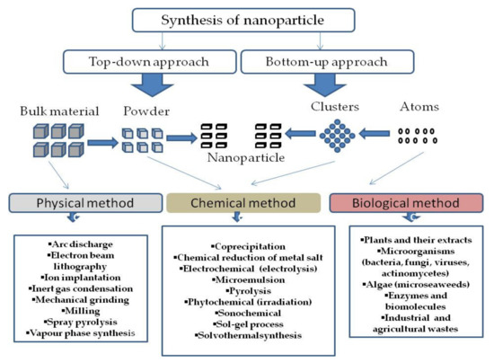 Consequent to the continuous utility of MNPs in several modern-day applications, the method for their preparation needs to be safe to achieve better control of desirable physicochemical and bio-functional properties. Several methods and modifications have been explored for their synthesis [14]. Over the years, NPs have continuously been used and modified to enable their application in various fields ranging from agriculture and biomedicine. The techniques developed for the synthesis of NPs are classified as top-down and bottom-up. The top-down approach reduces bulk material of interest to NPs, while the bottom-up approach build-up smaller material into the required nanostructure [32]. Further, these techniques are classified into physical, chemical, and biological methods of NP synthesis as depicted in Figure 1. Physical methods mainly operate on a top-down strategy where bulk materials are systematically broken down bit by bit to produce finely divided NPs [4]. The physical methods rely on mechanical pressure, electrical and radiation energy, melting, evaporation, or condensation techniques to produce NPs. Examples include vapor condensation, aerosol, laser ablation, pyrolytic, high-energy ball milling, laser pyrolysis, inert gas condensation, and mechanical crushing processes [4]. The chemical methods involve the use of organic and inorganic substances, including sodium citrate, elemental hydrogen, sodium borohydride, hydrazine, dimethylformamide, and ascorbate as reducing agents for the synthesis of the NPs. Sol-gel, hydrothermal, chemical vapour deposition, microemulsion, and polyol techniques are the commonly used chemical methods [4].