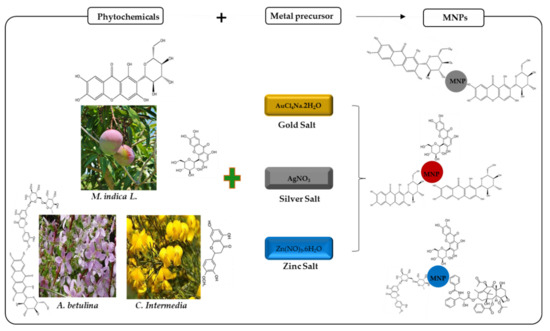 The potential of plants to bioaccumulate heavy metals suggests their use in the transformation of metal ions into MNPs. Alfalfa sprouts were the first plant reportedly used for the synthesis of AgNPs [62]. Subsequently, different plant species along with a variety of bioactive compounds have been explored for the production of MNPs including gold, silver, zinc, iron, copper, and platinum. Studies have shown that the reduction and stabilization of MNPs are achieved through the action of diverse compounds like proteins, amino acids, polysaccharides, and phytochemicals like flavonoids, alkaloids, tannin, and polyphenols present in the plants [63,64]. With the plant-derived approach, synthesis and purification are quicker and easier compared to the microbial-mediated approach [2,62].
