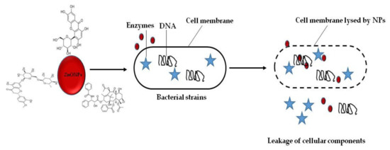 Mechanism of ZnO NPs against bacterial strains. ZnO NPs exhibited remarkable inhibition of cell growth and cell death in bacterial strains following the direct interaction between the ZnO NPs and the bacterial cell surface. Adapted from [81].