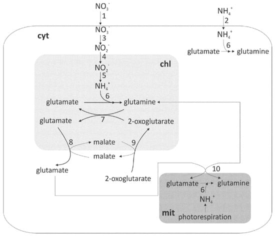 Schematic representation of plant nitrate assimilation. Reactions take place in mitochondrium (mit), chloroplast (chl), and cytoplasm (cyt). Enzymes and transporters are symbolized by numbers: 1—nitrate transporter, 2—ammonium transporter, 3—nitrate reductase, 4—nitrite transporter, 5—nitrite reductase, 6—glutamine synthetase, 7—glutamate synthase, 8—plastidic glutamate–malate translocator, 9—plastidic 2-oxoglutarate–malate translocator, and 10—mitochondrial glutamate–glutamine translocator. The major pathway of nitrate assimilation is shown in bold. Modified from [].