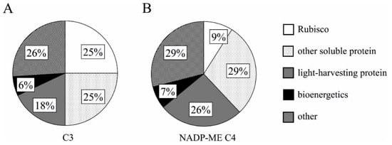 Nitrogen allocation on the percentage of different N components within the leaf in C3 (A) and NADP-ME C4 (B) plants. Modified by Mu and Chen [].