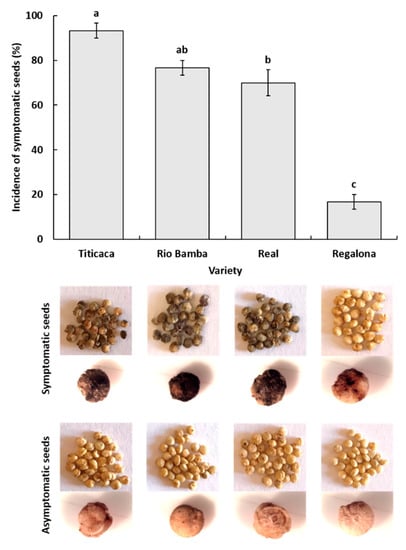 - Incidence (%) of asymptomatic and symptomatic seeds is indicated for each variety as the average (±standard error, SE) of three biological replicates. Data were subject to one-way analysis of variance by considering “variety” as a factor and “incidence” as a variable.
