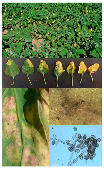 Field view of quinoa plants with foliar chlorosis/yellowing detected in June 2017 on Regalona plots in a trial located at Papiano (Perugia, Umbria, Central Italy) (a); yellow chlorotic spots on the upper side of Regalona leaves (b) to which corresponded a black-grey efflorescence on the adaxial surface (c,d) consisting of zoosporangiophores and zoosporangia of the pathogen (e, scale bar 50 μm).