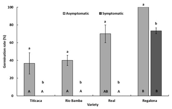 Within each seed category (symptomatic and asymptomatic), significant differences (p ≤ 0.05) in germination rate among the four varieties were detected (Figure 3). In detail, considering asymptomatic seeds, the Regalona variety showed the highest (p ≤ 0.05) germination rate (100%), followed by Real (70%), Rio Bamba (40%), and Titicaca (36.6%) (Figure 3). Only the germination rate of asymptomatic seeds of the Real variety was not significantly different (p ≥ 0.05) from that of Regalona (Figure 3). Considering symptomatic seeds, no germination was recorded in the Titicaca, Rio Bamba, and Real varieties, while symptomatic seeds of the Regalona variety showed a germination rate of 73.3% (Figure 3).