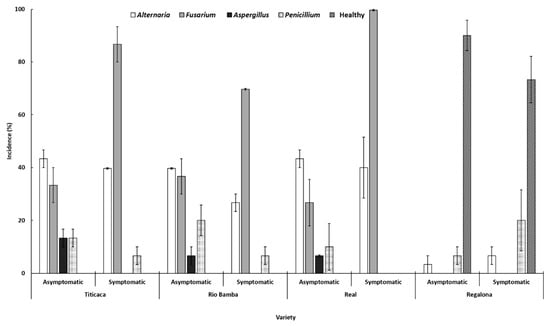 Significant differences (p ≤ 0.05) among the incidences of different fungal genera within each “variety–fungal genera” combination were also detected. In particular, Fusarium incidence in symptomatic seeds of Titicaca, Rio Bamba, and Real varieties (87%, 70%, and 97%, respectively, as above reported) was significantly higher (p ≤ 0.05) than that recorded in asymptomatic seeds (33%, 37%, and 27%, respectively). No significant differences (p ≥ 0.05) of Aspergillus and Penicillium incidences were detected among the different seed categories of Titicaca, Rio Bamba, and Real. Similarly, the incidence of healthy seeds was not significantly different (p ≤ 0.05) among the two different seed categories in the Regalona variety (Figure 4).