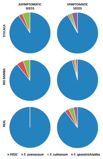 Incidence (%) of the different Fusarium species obtained from the asymptomatic and symptomatic seeds of the Titicaca, Rio Bamba, and Real varieties. No Fusarium isolates were obtained from the Regalona variety. Pie charts show the average of the Fusarium species incidence on the total of Fusarium isolates developed from three replicates, with 10 seeds for each replicate, for a total of 30 seeds per seed category (asymptomatic, symptomatic) for each quinoa variety. FIESC = Fusarium incarnatum-equiseti species complex.