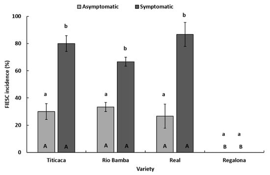 Therefore, FIESC incidence was investigated more in-depth. In detail, within each seed category (symptomatic, asymptomatic), no significant differences (p ≥ 0.05) in FIESC incidence between the three varieties (Titicaca, Rio Bamba, and Real) affected by FIESC were detected (Figure 6), while, within each variety, significant differences (p ≤ 0.05) in FIESC incidence between the two seed categories were observed. In particular, in Titicaca, Rio Bamba, and Real varieties, symptomatic seeds showed FIESC incidences (80, 66, and 86%, respectively) significantly higher (p ≤ 0.05) than those recorded in asymptomatic seeds (30, 33, and 26%, respectively) (Figure 6).