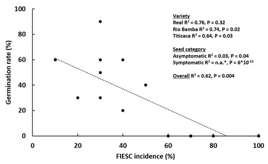 Correlation between seed germination rate (%) of the Titicaca, Rio Bamba, and Real quinoa varieties and Fusarium incarnatum-equiseti species complex (FIESC) incidence (%). The three replicates for each “seed category–variety” combination are shown separately. * No germination was detected in symptomatic seeds and no R2 was available.
