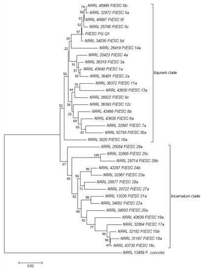 Neighbor-joining tree based on partial translation elongation factor 1 α (tef1α) gene sequences, showing the phylogenetic relationships between the FIESC-PG-Q1 isolate obtained in the present research and validated phylogenetic species of the Fusarium incarnatum-equiseti species complex (FIESC). The Fusarium concolor isolate NRRL 13459 was included as an outgroup. The optimal tree with the sum of branch length = 0.64901758 is shown. The percentage of replicate trees in which the associated taxa clustered together in the bootstrap test (1000 replicates) is shown next to the branches []. The tree is drawn to scale, with branch lengths in the same units as those of the evolutionary distances used to infer the phylogenetic tree. The evolutionary distances were computed using the maximum composite likelihood method [] and are in the units of the number of base substitutions per site. The analysis involved 36 nucleotide sequences. All positions containing gaps and missing data were eliminated. There was a total of 545 positions in the final dataset. Evolutionary analyses were conducted in MEGA7 [].