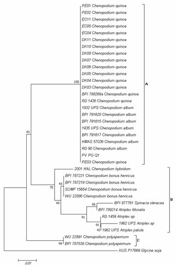 According to References [,], phylogenetic analyses were performed as previously described (Section 4.4) by using partial ITS region sequences of the isolate obtained in the present research and denominated PV-PG-Q1 and those of validated Peronospora species from C. quinoa and other plant species belonging to the genera Chenopodium, Spinacia, and Atriplex in the Amaranthaceae family reported in GenBank (Supplementary Table S2). The Peronospora manshurica (Naumov) Syd. isolate KUS-F17669 from Glycine soja Hort. was included as an outgroup [,].