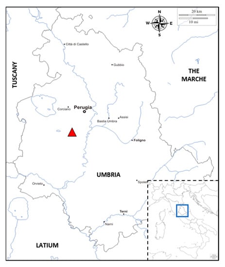 Map of the Umbria region (Central Italy, grey line) showing the experimental field trial location (red triangle) and neighboring regions. In the bottom right corner (outlined box), a map of Italy indicates the region’s location (blue box) in the national geographical context.