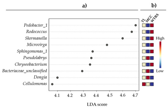 (a) Linear discriminant analysis (LDA) scores and, (b) heatmap from blue (low) via white to red (high) of genus relative abundances in root-associated soil of wild tomato related species (WTRS), tomato landraces (TL), and modern commercial cultivars (MCC).