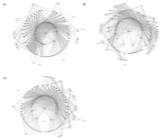 Co-presence network for the couples: (a) tomato landraces:wild tomato related species, (b) modern commercial cultivars:tomato landraces, (c) modern commercial cultivars:wild tomato related species. Node sizes reflect average relative abundance of each KEGG module. The line thickness is proportional to the edge weight. Node colors: green for wild tomato related species, blue for tomato landraces and red for modern commercial cultivars.