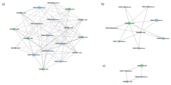 Three (a–c) most connected clusters in co-presence networks for the couple tomato landraces (blue):wild tomato related species (green). Node sizes reflect average relative abundance of each KEGG module. The line thickness is proportional to the edge weight.
