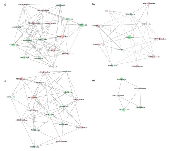 Four (a–d) most connected clusters in co-presence networks for the couple modern commercial cultivars (red):wild tomato relates species (green). Node sizes reflect average relative abundance of each KEGG module. The line thickness is proportional to the edge weight.