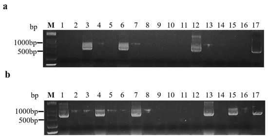 Agarose gel analysis of RT-PCR products using BrYV primers from A. thaliana plants inoculated by aphids. (a) Aphids that acquired the virus from frozen infected leaves; (b) aphids that acquired the virus from transgenic A. thaliana line 412 leaves. M: Marker (DCL 2000, Tsingke, Beijing, China); lines 1–16: aphids inoculated through A. thaliana; line 17: positive control.