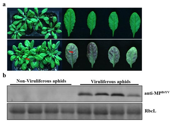 Symptoms and virus detection in A. thaliana inoculated with BrYV by aphids. (a) Typical symptoms of purple leaves on A. thaliana plants at 14 days post-inoculation by six viruliferous aphids. (b) Western blotting analyses of the accumulation of BrYV MP extracted from A. thaliana upper leaves.