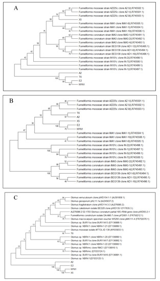 Pm1 sequences (A), Pm2 sequences (B) and AM fungi isolates identified on the basis of both PT1 and SSU rDNA (C) region sequences of the Glomerales. The percentage of replicate trees in which the associated taxa clustered together in the bootstrap test (1000 replicates) are shown next to the branches. The tree is drawn to scale, with branch lengths in the same units as those of the evolutionary distances used to infer the phylogenetic tree. The evolutionary distances were computed using the maximum composite likelihood method and are in the units of the number of base substitutions per site. Evolutionary analyses were conducted in MEGA X. (A) The length of partial sequence of PT1 gene is 320 bp, and the sum of branch length = 1.21661574; (B) The length of partial sequence of PT1 gene is about 680 bp, and the sum of branch length = 0.22664112. (C) The length of partial sequence of SSU fragment is about 1600 bp, and the sum of branch length = 126719649.