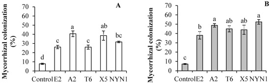 A comparison of tomato root colonization (%) by isolates of arbuscular mycorrhizal fungi during the autumn–winter growing season (A) and the spring–summer season (B). Different letters indicate significant differences among isolates as revealed in a one-way ANOVA and followed by a Fisher’s least significant difference t test (LSD test) at p ≤ 0.05.