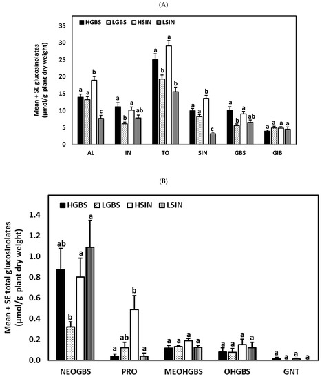 Mean ± SE glucosinolate content (µmol g−1 plant dry weight) in kale genotypes high in glucobrassicin (HGBS), low in glucobrassicin (LGBS), high in sinigrin (HSIN), and low in sinigrin (LSIN). The glucosinolates shown are total aliphatic (AL), total indolic (IN), total glucosinolates (TO), sinigrin (SIN), glucobrassicin (GBS), and glucoiberin (GIB) (A), and neoglucobrassicin (NEO), progoitrin (PRO), 4-methoxyglucobrassicin (MEOHGBS), 4-hydroxyglucobrassicin (OHGBS), and gluconasturtiin (GNT) (B). Post hoc tests with a significance level of p ≤ 0.05 were run to compare differences in glucosinolate content among genotypes. Significant differences are shown with different lowercase letters.