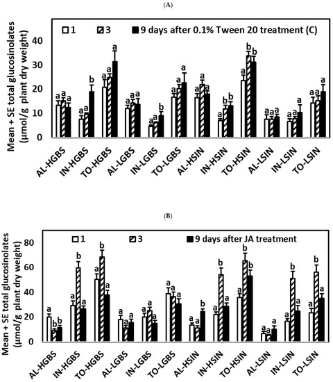 For plants of the HGBS and HSIN genotypes, significant differences across times were found for AL, IN, and TO (Tables S2 and S3; Figure 2B). Concentrations of AL were highest 1 and 9 days after treatment for plants of the HGBS and HSIN genotypes, respectively. For IN and TO, concentrations were highest 3 days after treatment. For plants of the LGBS genotype, differences across times were not significant for the main glucosinolates. For plants of the LSIN genotype, significant differences across times were found for IN and TO, which contents were highest after 3 days. Thus, for JA-treated plants of the HGBS, HSIN, and LSIN genotypes, IN and TO contents were highest 3 days after treatment.