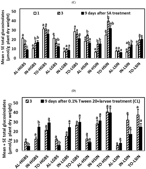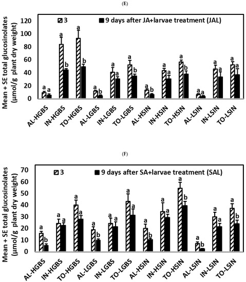 Mean ± SE glucosinolate content (µmol g−1 plant dry weight) in kale genotypes high in glucobrassicin (HGBS), low in glucobrassicin (LGBS), high in sinigrin (HSIN), and low in sinigrin (LSIN) 1, 3, and 9 days after treatment, respectively. The treatments are control (C) (A), jasmonic acid (JA) (B), salicylic acid (SA) (C), control with larvae (CL) (D), JA with larvae (JAL) (E), and SA with larvae (SAL) (F). The glucosinolates shown are total aliphatic (AL), total indolic (IN), and total glucosinolates (TO). Post hoc tests with a significance level of p ≤ 0.05 were run to compare differences among times after treatment within subgroups of total glucosinolates and genotype. Significant differences are shown with different lowercase letters.