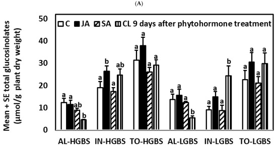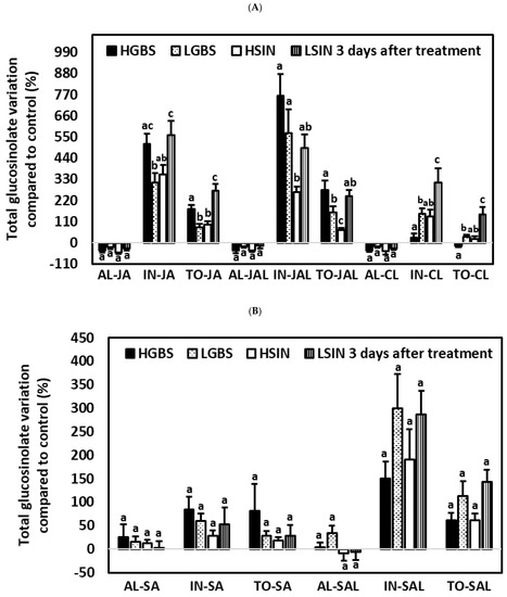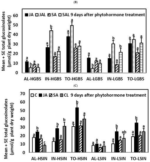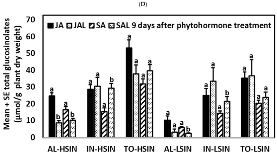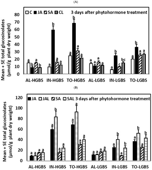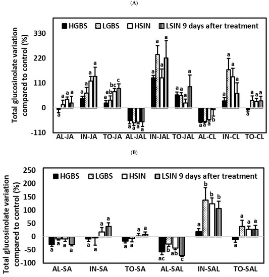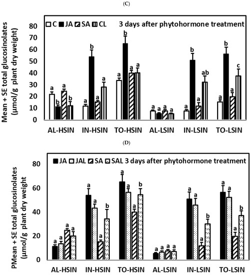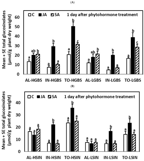 Three days after the application of JA and SA, IN and TO contents continued to be higher in JA-treated plants than in plants treated with SA and control plants (Tables S4 and S5; Figure 4). JA treatment increased IN and decreased AL contents in plants of the high glucosinolate genotypes HGBS and HSIN. In contrast, the SA treatment had no significant effect on glucosinolates in plants of any of the genotypes.
