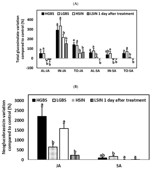 Percent changes in AL and TO contents in JA- and SA-treated plants were higher in plants of the HGBS and LGBS genotypes than in the HSIN and LSIN genotypes (Figure 6A). Changes in glucosinolate content among JA-treated plants of the four plant genotypes were mostly due to an increase in IN contents. In JA-treated plants, IN contents increased between 151.9% and 335.7%, and the percentage of increase was higher in plants of the genotypes HGBS and LGBS than in plants of the genotype LSIN. The glucosinolate that increased most was NEO, which increased more in the HGBS and HSIN genotypes (2198.0% and 1584.8% increases, respectively) than in the LGBS and LSIN genotypes (Figure 6B). In SA-treated plants, changes in IN contents ranged from a 5% decrease in plants of the HSIN genotype to a 51.6% increase in plants of the LGBS genotype. This percent change in IN content was higher in the genotype LGBS than in the genotypes HSIN and LSIN. As in the case of JA-treated plants, SA-treated plants showed an increase in NEO content, but this increase was not as high as in JA-treated plants. In SA-treated plants, NEO also showed a higher increase in the HGBS and LGBS genotypes (94.5% and 171.8% increases, respectively) than in the LSIN and HSIN genotypes. As a result of JA treatment, the glucosinolate GIB increased more in plants of the genotypes HGBS, BGBS, and HSIN (69.3%, 60.8%, and 24.2% increases, respectively) than in plants of the genotype LSIN, in which this glucosinolate decreased. Changes in glucosinolate content among SA-treated plants in the four plant genotypes were mostly due to the increase in GIB, which increased more in plants of the HGBS and LGBS genotypes (97.2% and 82.6% increases, respectively) than in plants of the HSIN and LSIN genotypes.