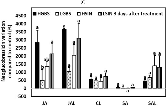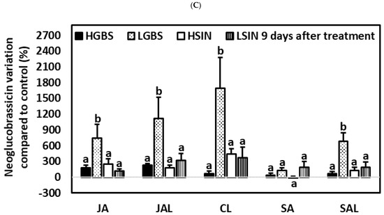Among individual glucosinolates, significant changes in percentage variation among genotypes were observed in NEO in all treatments except the SA treatment, and these changes in NEO were highest in the LGBS genotype (Table 1 and Table S9; Figure 8C). These percent increases in NEO content in plants of the LGBS genotype were 746.9%, 1122.6%, 685.7%, and 1697.2% for the JA, JAL, SAL, and CL treatments, respectively. In the SA and SAL treatments, differences in percentage variation among genotypes were also significant for SIN, being lowest in plants of the LSIN genotype, which plants showed decreases of −45.7% and −75.4% for the SA and SAL treatments, respectively. In the SAL treatment, the percentage decrease in GIB was higher in plants of the HSIN and LSIN genotypes (−57.4% and −68.8%, respectively) than in plants of the LGBS genotype.
