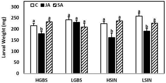 For the genotypes HGBS, HSIN, and LSIN, M. brassicae larval weights were lower in JA-treated plants than in SA-treated and control plants (Figure 9; Table S11). Larval weights in the SA and control treatments were not significantly different. In plants of the LGBS genotype, differences in larval weights among treatments were not significantly different.