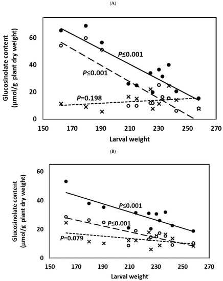 Pearson’s correlations (significance level of p ≤ 0.05) between plant glucosinolate content and larval weight at the end of the experiment considering glucosinolate content 3 days (A) and 9 days (B) after JA and SA treatment. Data used were the glucosinolate averages corresponding to each plant genotype (HGBS, LGBS, HSIN, and LSIN) and treatment (C, JA, and SA) (n = 12). Data points are crosses, white circles, and black circles for aliphatic, indolic, and total glucosinolates, respectively. Trends lines are short-dashed, long-dashed, and solid lines for aliphatic, indolic, and total glucosinolates, respectively. Significant differences are shown with different lowercase letters.
