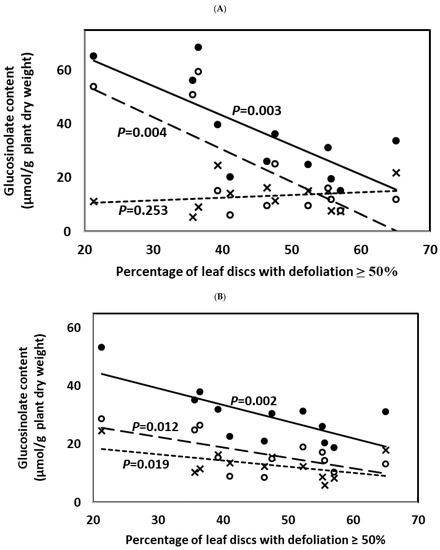 Pearson’s correlations (significance level of p ≤ 0.05) between plant glucosinolate content and herbivory (percentage of leaf discs with defoliation ≥50%) considering glucosinolate content 3 days (A) and 9 days (B) after JA and SA treatment. Data used were the glucosinolate averages corresponding to each plant genotype (HGBS, LGBS, HSIN, and LSIN) and treatment (C, JA, and SA) (n = 12). Data points are crosses, white circles, and black circles for aliphatic, indolic, and total glucosinolates, respectively. Trends lines are short-dashed, long-dashed, and solid lines for aliphatic, indolic, and total glucosinolates, respectively. Significant differences are shown with different lowercase letters.